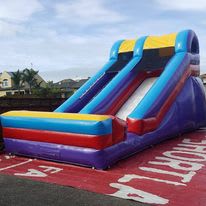 Slide has climbing stairs on left hand side of slide and kids slide down wide slide on right.